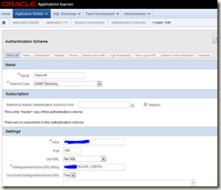 Once you have your application the first thing to do is change the authorization scheme in use to another default one from oracle “LDAP Directory”